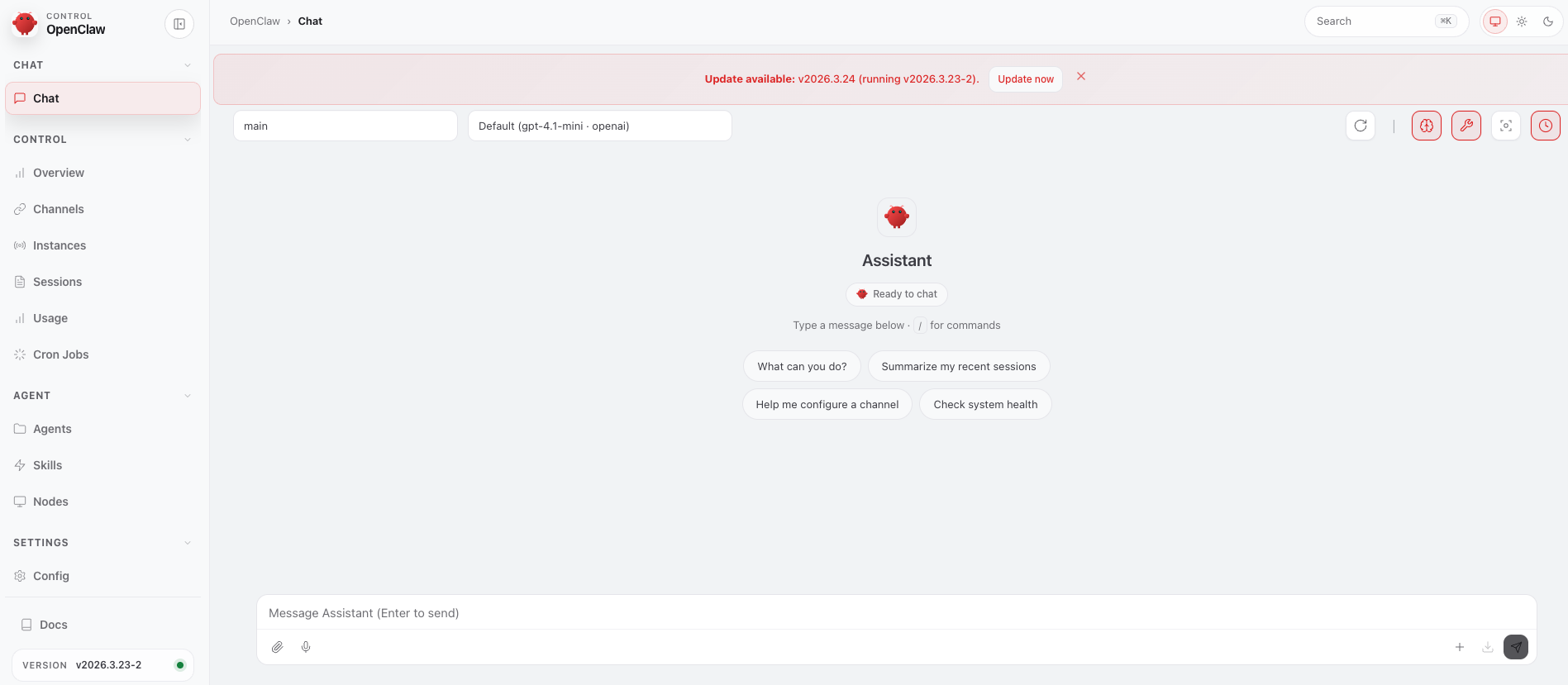 🦞 OpenClaw 2026.3.23-2 (7ffe7e4) — Welcome to the command line: where dreams compile and confidence segfaults.