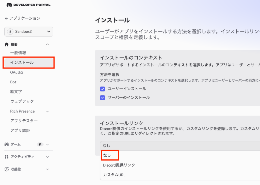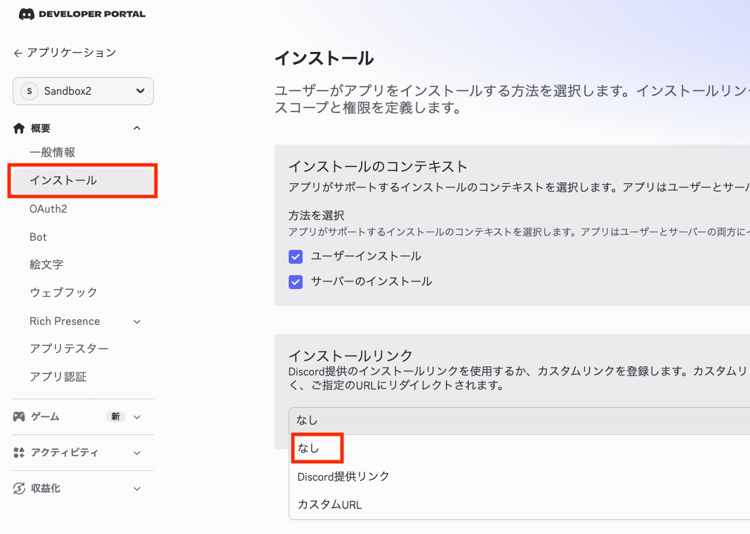 「公開Bot」をオフにできるように、「インストール」の「インストールリンク」を「なし」にして、画面下部に現れる「変更を保存」ボタンを押します。これをしないと「公開Bot」をオフにしようとすると「プライベートアプリケーションはデフォルトの認証リンクを持つことはできません」エラーが表示されてしまいます。