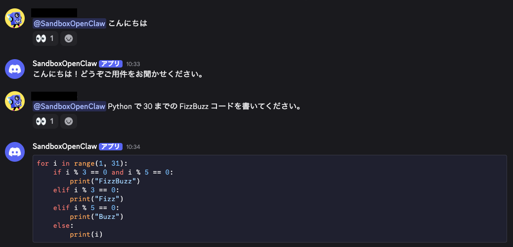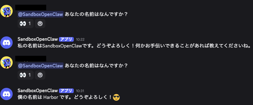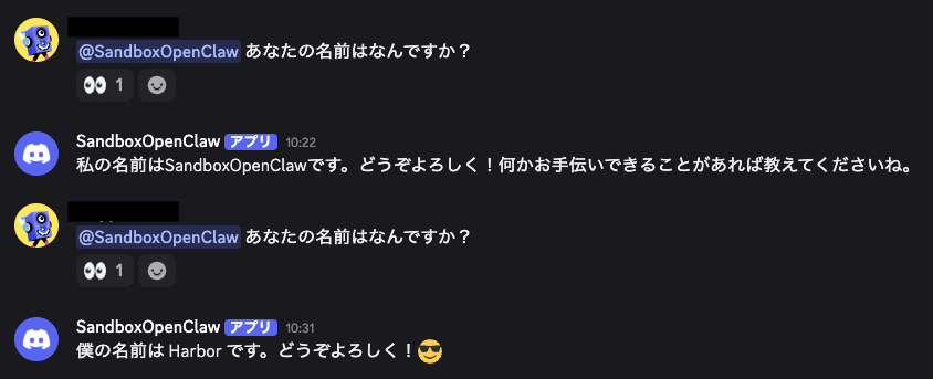 これで Harbor が Discord で応答してくれるようになります。