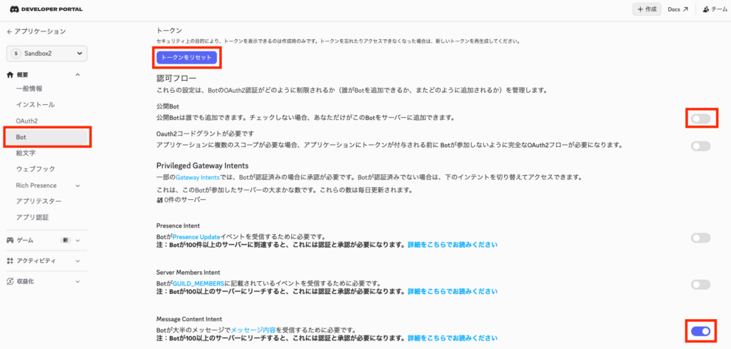次に、「Bot」の「公開Bot」をオフ、「Message Content Intent」をオンにして変更を保存します。そのあと、「トークンをリセット」ボタンと、押すと出てくる「実行します!」ボタンを押すと (その後認証する)、 表示されるトークンを後で使うのでメモしておいてください。