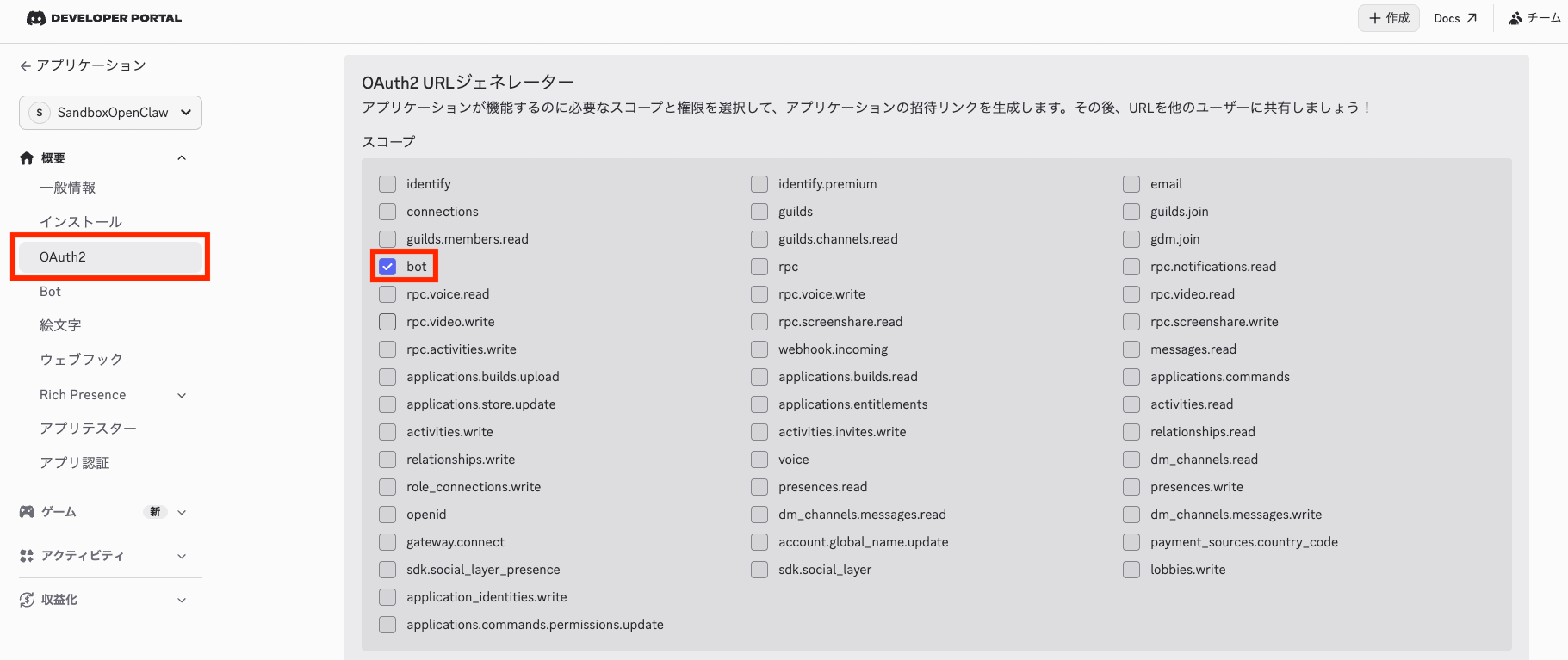 ボットを招待するために招待リンクを生成します。