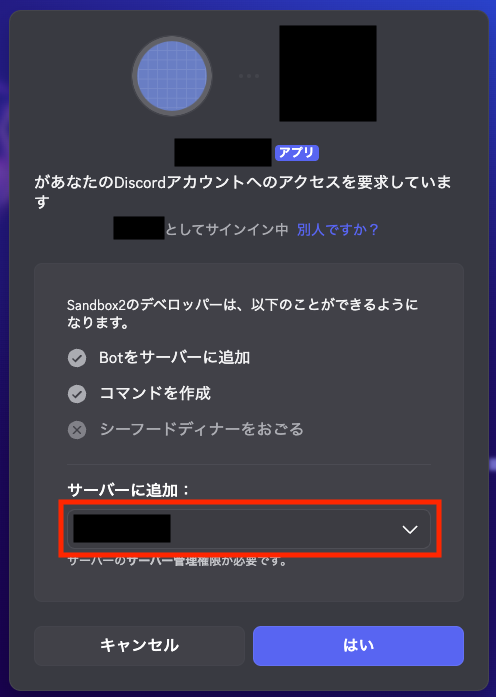 「サーバーに追加」の箇所でボットを追加したいサーバーを選択して「はい」を押します。