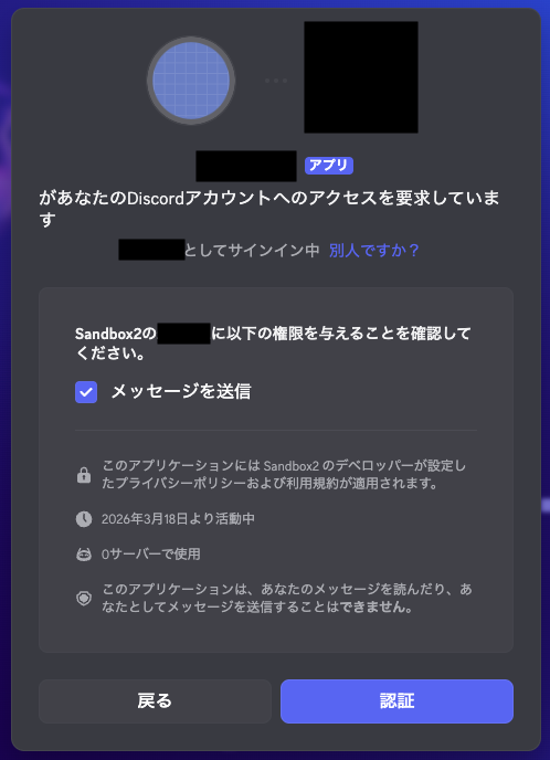「生成されたURL」をブラウザのアドレスバーにペーストして開くと、以下の画面が出てボットをサーバーに追加できます。