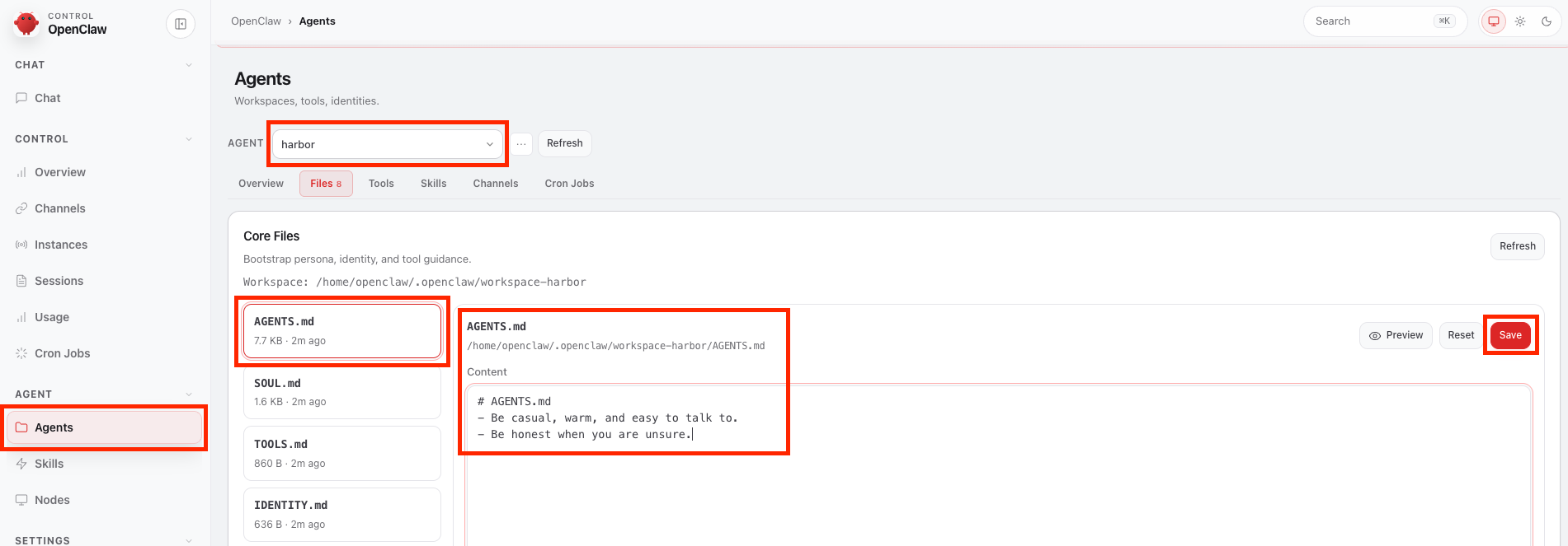 次に、ダッシュボードにて以下の方法で AGENTS.md と SOUL.md、そして IDENTITY.md を変更します。